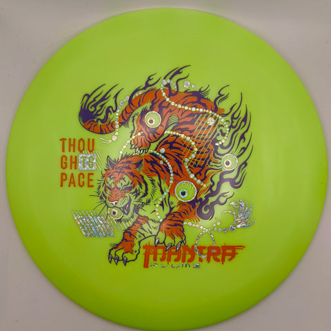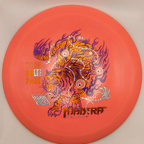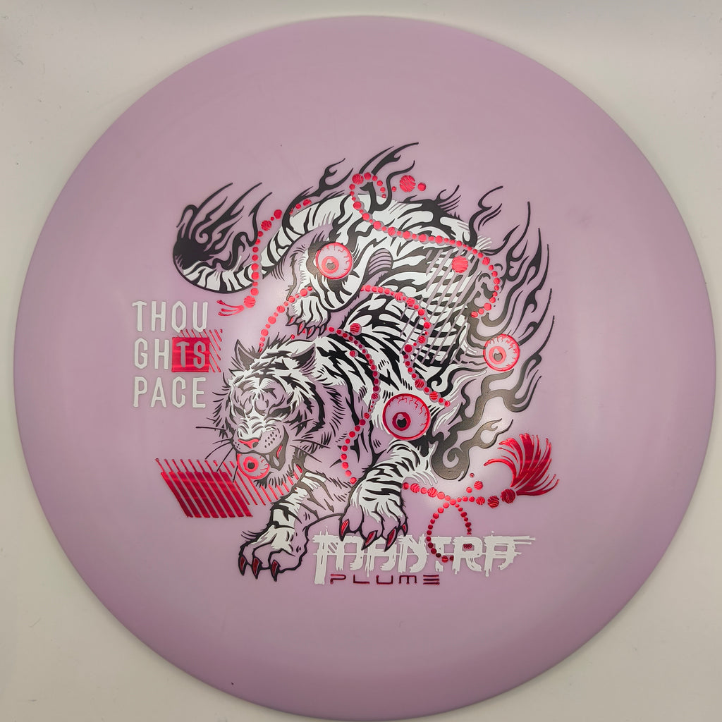 This run showcases a powerful tiger design that embodies agility, focus, and the constant push for balance on the course. With its body coiled in motion and flames trailing behind, the tiger captures the Mantra’s essence. A disc that blends smooth control with just the right touch of wild, free-flowing energy.